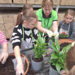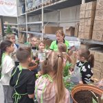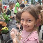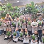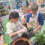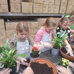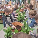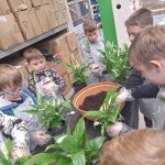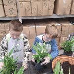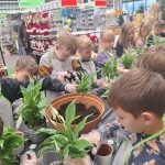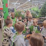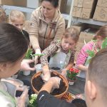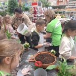 Następnie pracownik sklepu Pani Tamara zaprosiła dzieci na sklep, gdzie czekała na uczniów część praktyczna i specjalnie przygotowane stanowisko do ich pracy. Drugoklasiści otrzymali wszystkie potrzebne rzeczy niezbędne do wykonania zadania. Ubrani w fartuszki oraz rękawiczki ochronne wszyscy zabrali się do pracy – przesadzania roślin ozdobnych. Pracę uczniów podczas zajęć nadzorowała Pani prowadząca warsztaty, która dokładnie omawiała i instruowała dzieci czego używać oraz w jakiej kolejności, aby roślina miała jak najlepsze warunki do dalszego rozwoju. Samodzielne sadzenie roślin okazało się dużą frajdą dla wszystkich dzieci. Młodzi ogrodnicy mogli zabrać do domów swoje rośliny, aby tam móc dalej je pielęgnować i obserwować, jak rosną. Zajęcia sprawiły dzieciom dużo satysfakcji z samodzielnego sadzenia kwiatów.