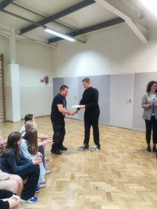 Po części artystycznej Pani Dyrektor wręczyła nagrody laureatom konkursu na nazwę nowej biblioteki. Zwycięską propozycją okazała się „Komnata Tajemnic”, autorstwa Ignacego Miotke z klasy 6c. Wyróżnienia otrzymali również Maksymilian Bach z klasy 4a oraz Mateusz Ruszczyk z klasy 2e. Nagrodzonym gratulujemy pomysłowości i wyobraźni.