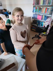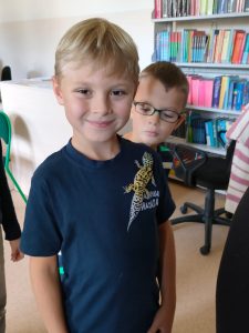 Następnie odbyło się pasowanie na czytelnika. Dzieci skupione uroczyście przyrzekały, że będą kochać i szanować książki. Podczas pasowania bibliotekarka, dotykając prawego ramienia każdego ucznia mówiła: ,,Pasuję Cię na czytelnika naszej biblioteki”. Każdy otrzymał również prezent – zakładkę do książki. Uczniowie wręczyli paniom laurkę z podziękowaniem i przyrzeczeniem, że będą szanować książki. Wszyscy opuścili bibliotekę z wypożyczoną książką. Mam nadzieję, że od tej pory pierwszaki często będą odwiedzali szkolną bibliotekę i rozbudzą w sobie potrzebę czytania oraz poznawania nowych bohaterów książkowych.
