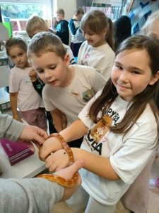 Dnia 28 listopada w bibliotece szkolnej odbyła się lekcja biblioteczna z udziałem uczniów klasy II d. Na początku spotkania pani bibliotekarka przedstawiła prezentację dotyczącą życia i twórczości pisarza Hansa Christiana Andersena. Następnie uczniowie wzięli udział w przedstawieniu teatrzyku kamishibai ”Brzydkie kaczątko”. Uczniowie przekonali się, że ta niewielkich rozmiarów drewniana „skrzynka” stanowi interesującą i nowatorską formę spotkania z książką. Na podsumowanie spotkania każdy z uczniów pokolorował kolorowankę Brzydkiego Kaczątka przygotowaną przez panią bibliotekarkę.
