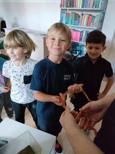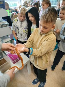 Dnia 15 maja biblioteka szkolna po raz kolejny gościła klasę I e na lekcji bibliotecznej. Na początku zajęć uczniowie zaznaczyli na tarczy zegarowej godzinę spotkania w bibliotece. Następnie poznali jedną z książek Agaty Giełczyńskiej pt. „Polowanie na ciasteczkowego potwora”. Bohaterka tego tomiku postanowiła dowiedzieć się dlaczego w domu znikają słodycze i kto jest ciasteczkowym potworem. Dzięki swojej pracy śledczej udało jej się odgadnąć zagadkę i wytropić sprawcę. Uczniowie z ogromnym zaciekawieniem wysłuchali treści książki po czym bezbłędnie odpowiedzieli na pytania przygotowane przez samego autora. Podsumowaniem spotkania było rozwiązanie przez uczniów labiryntu przygotowanego przez nauczyciela bibliotekarza.