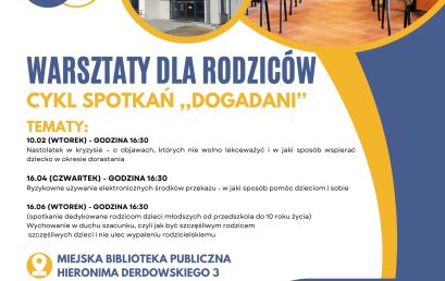 Zapraszamy chętnych rodziców i opiekunów na bezpłatne warsztaty. W cyklu spotkań „DOGADANI”. 🟨Są to bezpłatne warsztaty poświęcone wspieraniu dzieci i młodzieży w wyzwaniach współczesnego świata. Terminy i tematy spotkań: 📅 10.02 (wtorek), godz. 16:30 Nastolatek w kryzysie O objawach, których nie wolno lekceważyć, oraz o tym, jak wspierać dziecko w okresie dorastania. 📅 16.04 (czwartek), […]