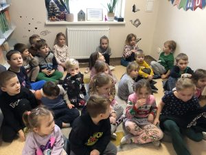 Podczas spotkania dzieci wysłuchały historii powstania książki o Kubusiu Puchatku oraz poznały postać autora – A.A. Milne’a. Następnie wysłuchały bajki pt. „Zima” z kolekcji książek o Kubusiu Puchatku.