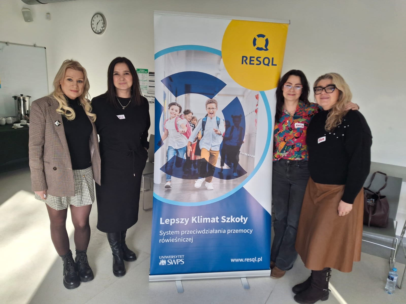 Naszą placówkę reprezentowały: Ewa Bobrowska, Anita Namiotko, Kamila Nowicka oraz Katarzyna Szczepańska — osoby na co dzień odpowiedzialne za przyjmowanie i prowadzenie interwencji w sytuacjach związanych z przemocą rówieśniczą.