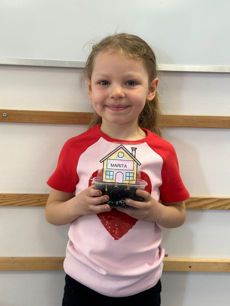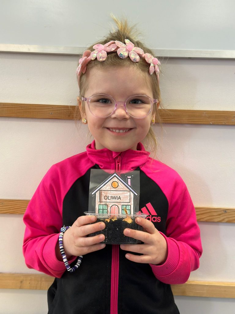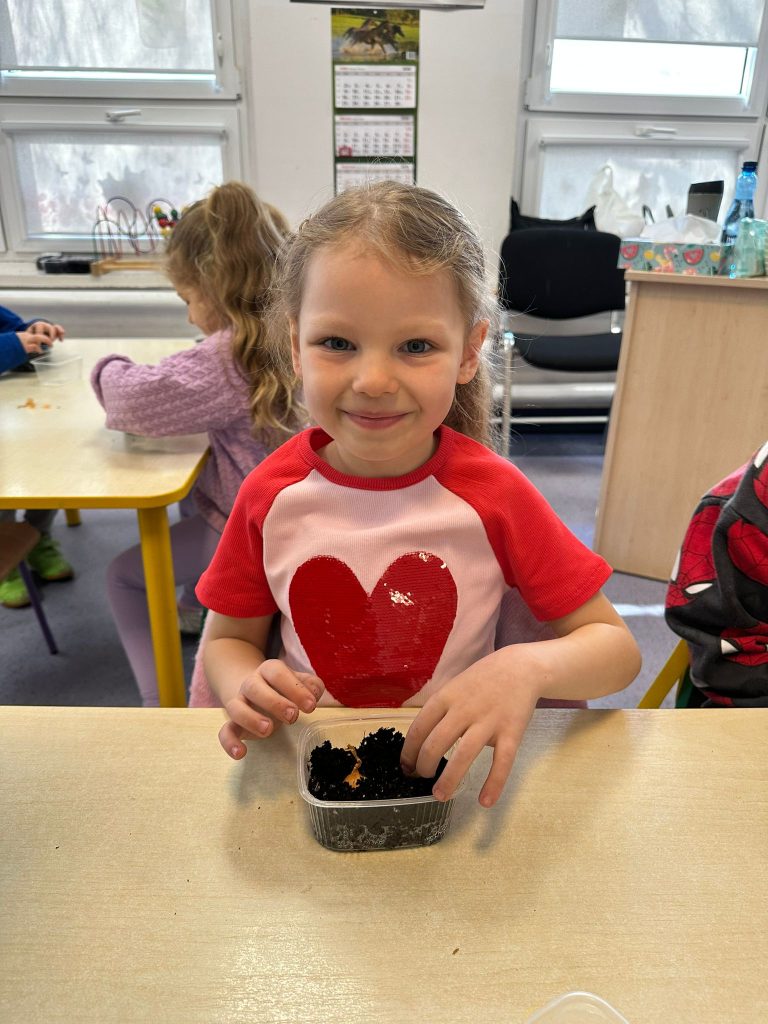 Na początku dowiedzieliśmy się, że cebula dymka to mała cebulka, którą sadzi się w ziemi, aby mogła urosnąć i dać plon. Następnie przygotowaliśmy doniczki oraz ziemię. Każde dziecko zrobiło w ziemi mały dołek i umieściło w nim cebulkę korzeniem do dołu, a potem delikatnie przysypało ją ziemią.