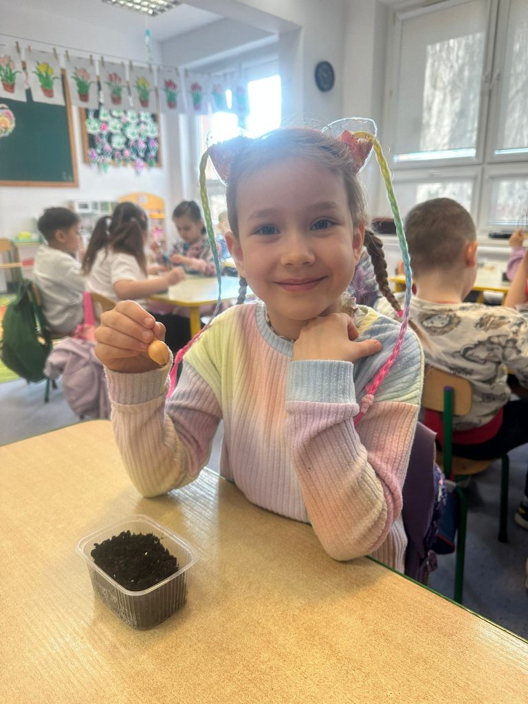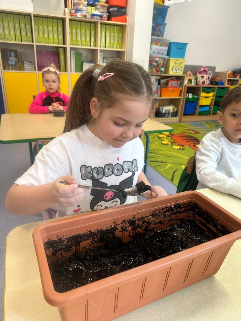 Dnia 23.03.2026 r. grupa Wilczki brała udział w zajęciach przyrodniczych, podczas których sadziliśmy cebulę dymkę, z której w przyszłości wyrośnie cebula.