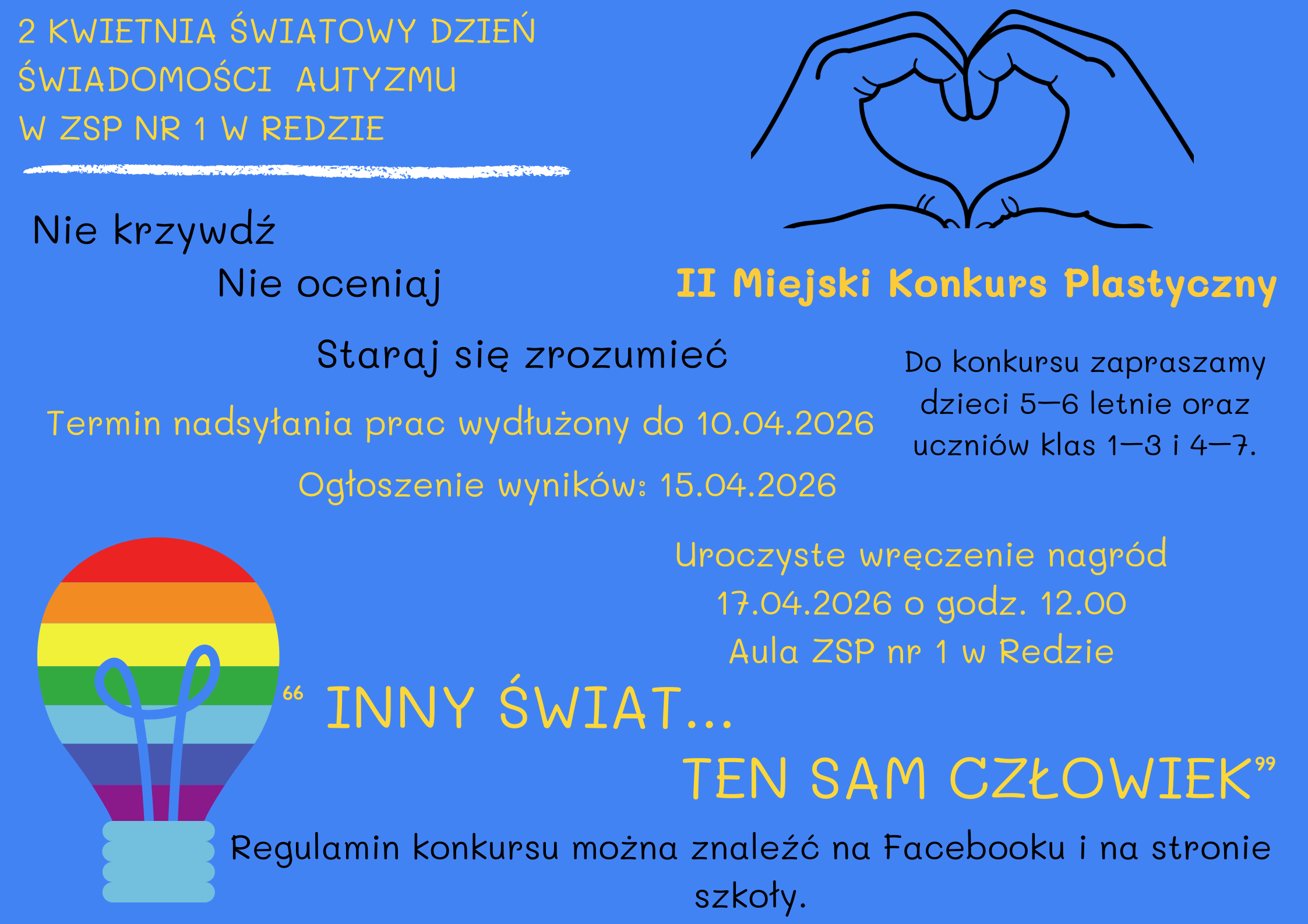 Z Okazji Światowego Dnia Świadomości Autyzmu serdecznie zapraszamy wszystkie chętne dzieci z zerówek szkolnych 5-6 latki, uczniów klas 1-3 oraz uczniów z klas: 4-7 do udziału w II Miejskim Konkursie Plastycznym pt.: „Inny świat, ten sam człowiek” organizowanym przez Zespół Szkolno-Przedszkolny nr 1 w Redzie.